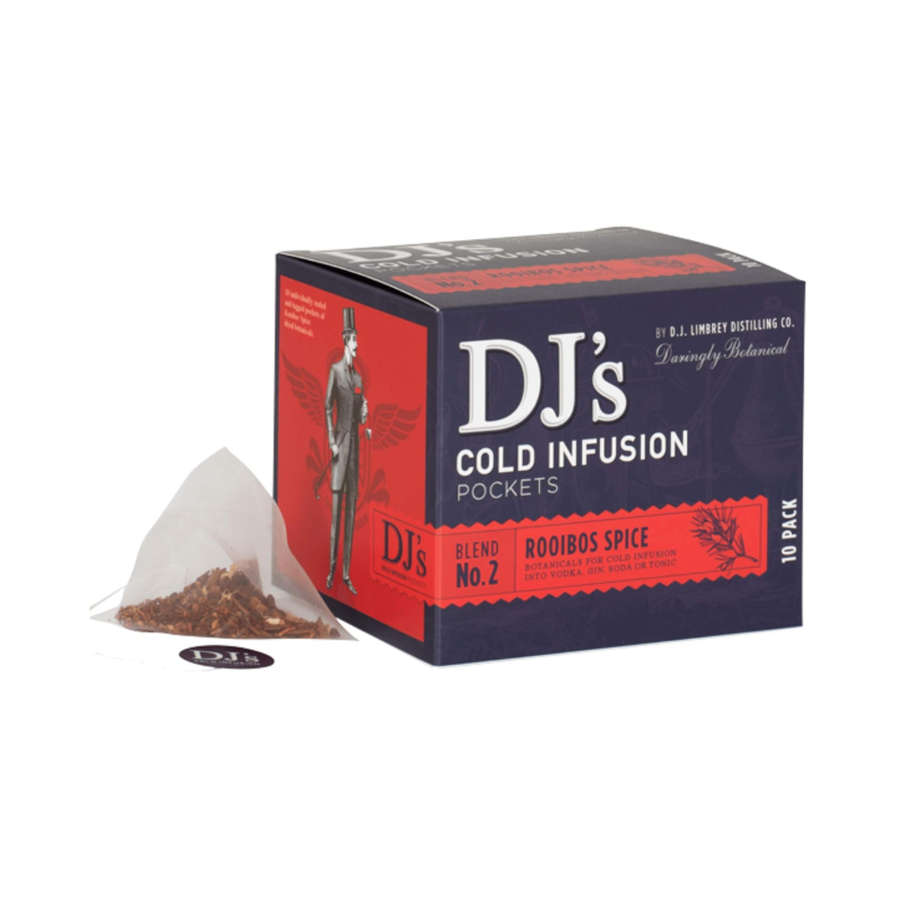 DJ's Cold Infusion Pockets Rooibos Spice Blend No.2 combines a fusion of Rooibos, Cinnamon, Ginger, Cardamom, Peppercorns, Cloves, & Natural Flavouring.
