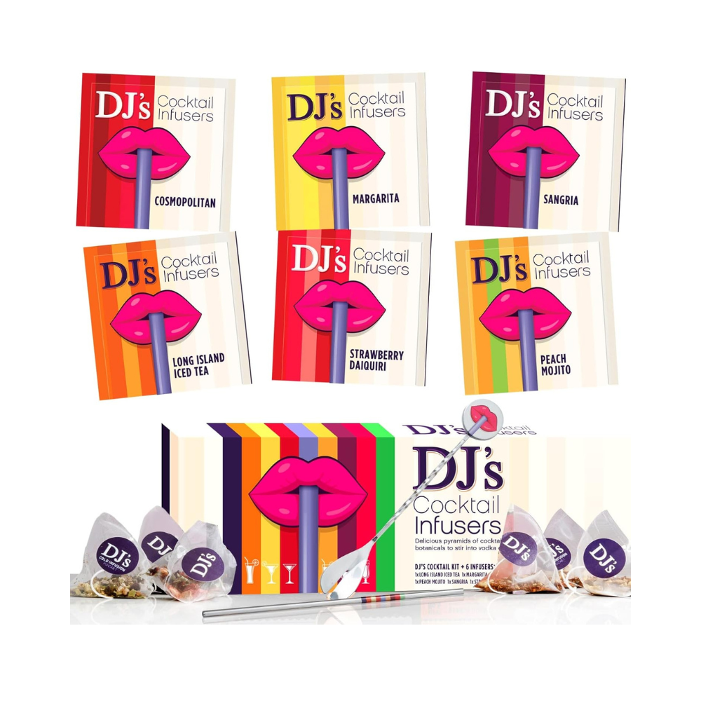 A luxurious cocktail making set featuring a shaker, jigger, pourer, 4 cocktail spoons, 4 straws, and 30 infusion pockets (6 flavours x 5 pockets - Long Island Iced Tea, Margarita, Cosmo, Peach Mojito, Sangria, & Strawberry Daiquiri).
